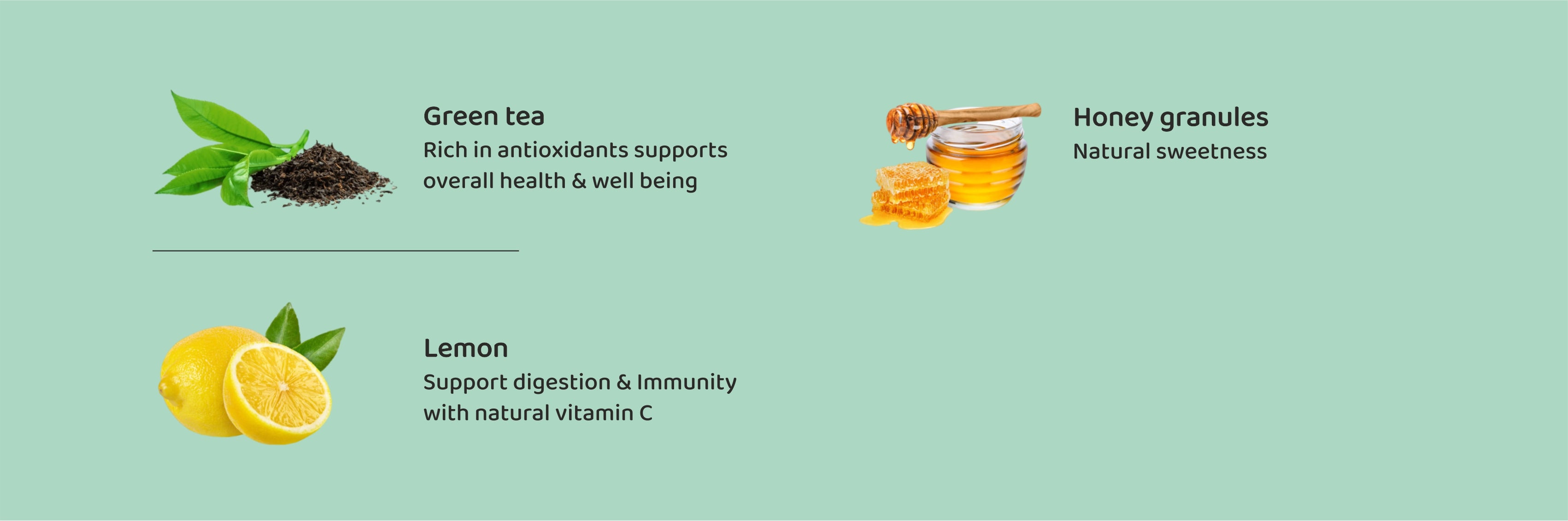 - Lemon Honey Detox green tea combines the refreshing zest of lemon with the natural sweetness of honey, infused in premium green tea leaves. This blend supports digestion, boosts metabolism, and aids in gentle detoxification. Rich in antioxidants, it helps combat free radicals and promotes overall wellness. Ideal for those seeking a natural, expert-recommended way to enhance vitality and maintain balance throughout the day.